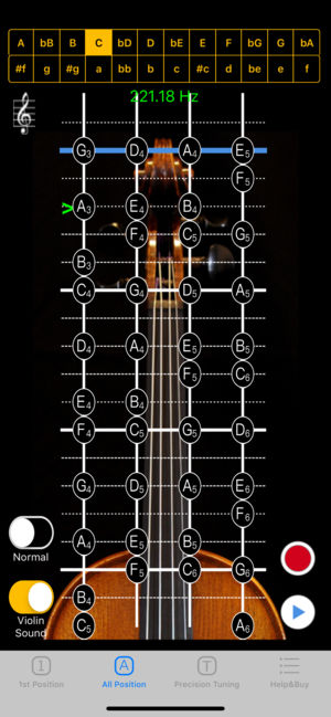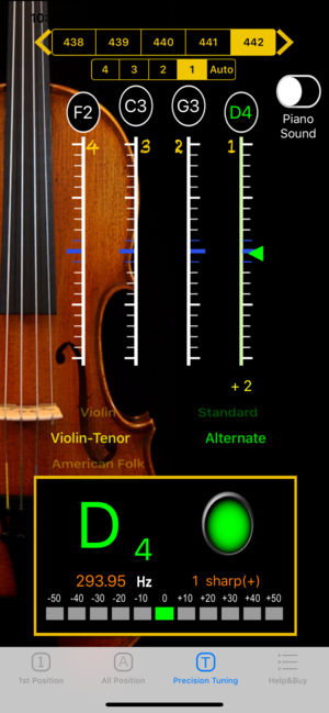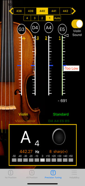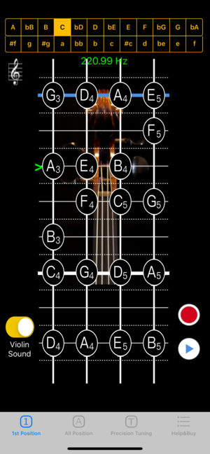 [小提琴音准-不止是调音器] 简洁的使用介面, 4弦图示音准位置, 噪音过滤, 音准显示稳定, 无需任何设定, 打开APP, 拉动小提琴, 自动将音准显示于画面弦上的相对应位置, 供练琴者比对自己左手按弦位置是否正确, 可以有效提升音准, 特别是音感不佳及不熟习把位的学琴者. 彻底解决, 左手按弦换把位时, 身旁没老师纠正音准的痛苦. 功能说明: [1把位分页] ▪ 空弦调音[免费] : 空弦时, 拉动小提琴任一弦, 绿色三角箭头若对准空弦上蓝线位置, 即为音准, 准确度在正负25分位(cents)内. 超出范围时, 绿色三角箭头会变成白色. ▪ 即时音准反馈[免费]…