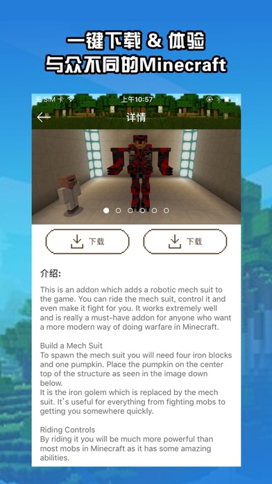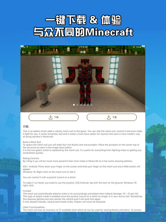 免责声明:这是一个非官方的应用程序。 我们不是Mojang AB关联或隶属于Mojang AB。 真正能在iOS上用的我的世界地图和Mod终于来了! 我的世界PE版在0.16.0版本中新增Addon插件功能。因此,广大iOS的我的世界玩家也能在手机上体验各式各样的地图和Mod了!这个应用为我的世界玩家提供各种有趣地图和插件,让你在我的世界尽情玩耍。 花式地图: ●现代城市地图 ●越狱游戏地图 ●丧尸竞技场地图 …… 花式Mod: ●恐龙Mod ●机器人Mod ●海绵宝宝Mod …… 我们会持续添加新的地图和Mod,所以还在犹豫什么,赶紧下载应用,紧跟更新来让你的Minecraft冒险更加丰富多彩吧!