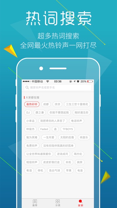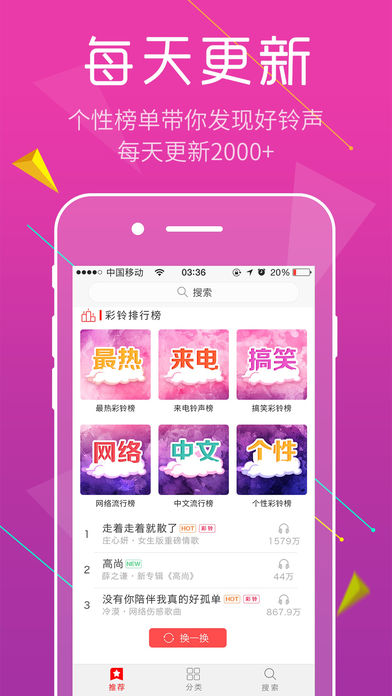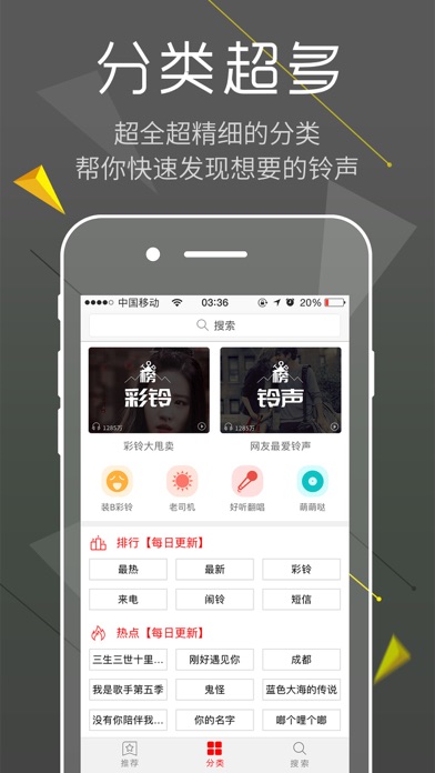 ·iPhone手机换彩铃专用软件,全网用户的选择。 ·500万首精选铃声,全网最全,每日更新高品质好听彩铃1000+。 【专注提供高音质好铃声】 【铃声最新】最新最火歌曲铃声,每日更新1000+,同步最热影视铃声、综艺节目铃声,好听铃声多多! 【独家特色】引入独家铃声资源,好声音经典翻唱等特色铃声资源,打造特色精品铃声。