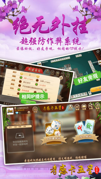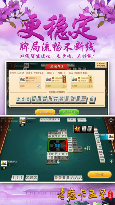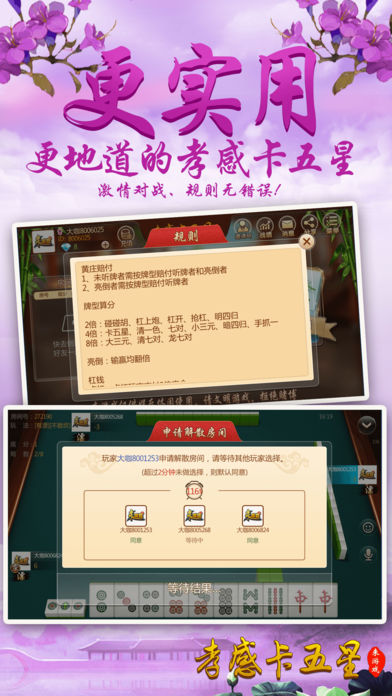 ~~~游戏介绍~~~ 【最地道】地道孝感麻将玩法,可碰、杠,不能吃牌,仅使用“条”“筒”花色及“中发白”共计84张牌进行3人游戏,杠钱单独结算。富有别致趣味性。要玩就玩孝感人自己的麻将。 【最好玩】再也不用苦于配桌,全民手机时代,你可以再手机上随时随地和亲朋好友搓麻将,是传统麻将馆的有力补充。快来和亲朋好友一起开房,决一高下吧! 【最稳定】大厂出品,确保游戏过程更加稳定,专心玩游戏,没有掉线卡顿烦恼。 【最靠谱】可以录像回放,同IP报警,杜绝外挂,真实可靠。 【最智能】智能提示、界面大方更具人性化,支持智能单独、分开支付房费。