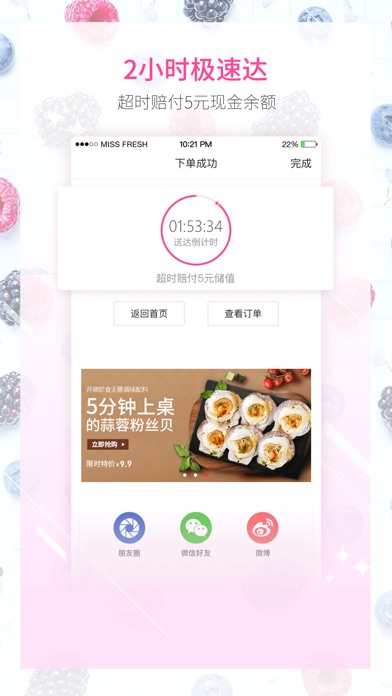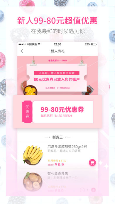 优质生鲜,2小时到。下载注册即送新人专享优惠。 为了全方位满足吃货的需求,我们的商品已经涵盖了水果、肉蛋、水产、蔬菜、饮品、乳品、零食、轻食、粮油等9个品类,是2,000,000吃货值得信赖的选择。 【产地直采】精选全球优质食材 专业食品买手团队常年在美国,智利,南非,澳洲等多个产地深入探索,只为把适宜的气候条件和地理环境下的优质食材送到您餐桌 【严格品控】我们知道,您的选择意味着信任。 每一款食材都要经过严格的筛选,只有合格率超过90%的食材才能入库进行第二次挑选。对每一道环节的严格把控,只为不负您的信任。 【2小时极速达】新鲜不应长久的等待 除华北、华东、华南三地分选中心外,我们已在全国8个城市建立了165个社区配送中心,保证站点辐射3公里内的用户,全部 配送过程由自有人员完成,保证2小时将美食送到您手上。 【全程100 %冷链体系】新鲜需要更专业的保障 我们拥有超大的冷库面积专业冷链物流体系,分三大温区保存食材,覆盖整个运输及储存过程。 产地到舌尖,给您最原始的新鲜。 我们用心挑选,只为您所见的每一款商品,都是精品。