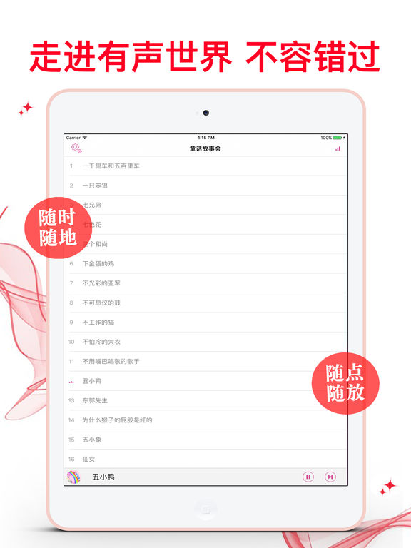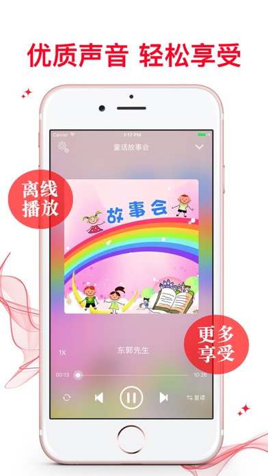 本应用中包含的童话故事,以丰富的想象力活跃宝宝的思维,生动的形象,美妙的故事可以帮助宝宝更早的认识社会,理解人生,他是引导宝宝做一个通达事理、明辨是非的好帮手。 软件特色: 1.丰富的离线数据包,一次下载,随时享受 2.通用应用,同时支持各种设备 3.可以自动顺序播放功能 4.可以自动记录播放位置,不用担心下次找不到听到哪 5.支持离线播放,即使不联网也一洋听,到哪都不怕 6.支持手动拖拽前进、后退播放 7.精确到分钟的睡眠定时功能,让您睡眠更轻松 8.支持多任务功能,让您一边享受精彩有声读物一边还能打开其他的软件……做一切你想同时做的事 9.在兼顾软件容量以及更多课程的情况下,我们最大限度保证音频的高质量,每个有声读物片段都是经过我们精选和亲测