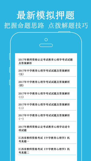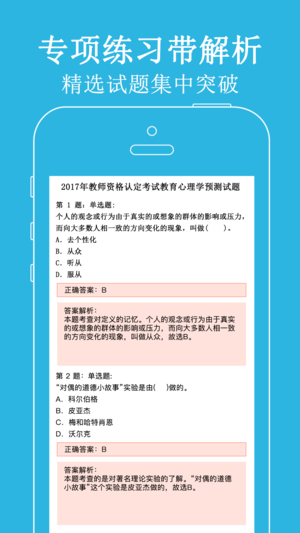本软件为教师招聘考试题库的软件,适合于2017公开招聘招聘考试,精选试题含试题解析,量身打造。 1、教育综合基础知识(中小学通用):教育综合基础知识习题强化练习,可选择不同题型,并可手动将易错或未牢固掌握的题加入复习库和错题库,以便反复练习,还包括模拟试题十五套。 2、幼儿园招聘试题:包括幼儿园教育理论专项练习和幼儿园学前教育专项练习,可选择不同题型,并可手动将易错或未牢固掌握的题加入复习库和错题库,以便反复练习,还包括模拟试题二十二套。 3、学科专业模拟试题:精选各个学科专业最新模拟押题,共199套,含解析,可自动将错题加入到错题库。 4、特岗教师招聘试题:精选特岗教师招聘试题,含解析,可自…
