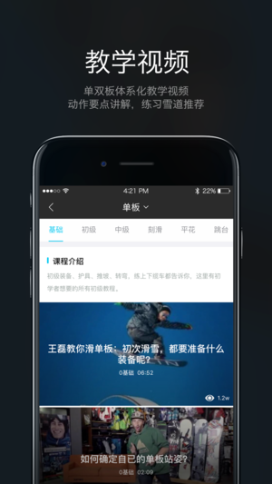 滑雪不想请教练? 海量单双板教学视频,带你从小白到高手。 最严谨的国外专业滑雪教学视频,精细汉化;从此告别滑雪必摔跤的魔咒。 精选滑雪集锦视频,陪伴你入坑之后的日日夜夜,再不用忍受视频网站广告,点开即看,在不能滑雪的日子里,拔草必备神器!