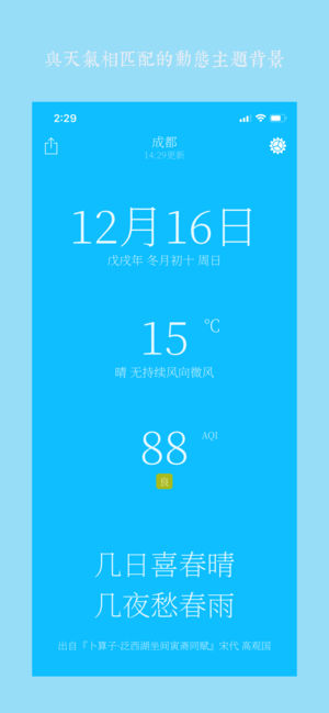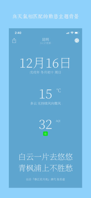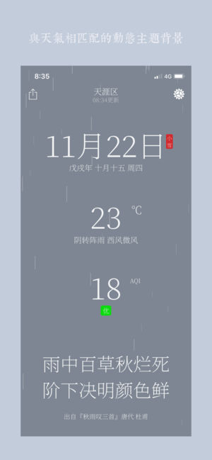 “诗雨”是一款极简而又富有诗情画意的天气预报、PM2.5和空气质量查看 App 。 取名“诗雨”,雨声诗意,即诗和雨。雨的声色与韵味,在中国文学里营造了多少清新空灵、深邃隽永的意境,似乎只有柔情旖旎的“月光”可以与之相媲美。月色可以疗伤,雨声可以解忧。雨的湿润缠绵,浸润了古往今来无数诗人词客的心灵,也浸透了浩繁厚重的历史诗卷。 这款 App 的另一愿望是当您面对屡屡爆表的空气指数无可奈何的时候,当您面对日益严重的糟糕天气无法躲避的时候,“诗雨”为您推荐一首古诗词,舒缓您此刻的心情,给您些许慰藉…… “诗雨”功能: - 全国各地的实况天气以及未来几天的天气预报;穿衣、洗车等各项生活指数 -…
