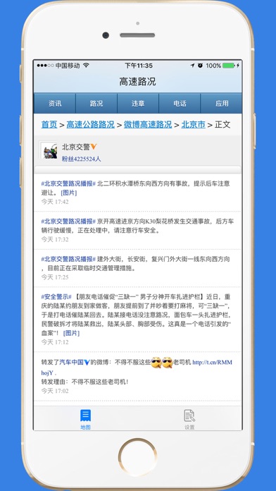 【产品简介】 这是一款全国高速路网实时路况查询的的APP,可以根据不同城市作为入口查询地图上的路况,也可以查到全国高速公路的咨询电话,还可以免费查询全国车辆的违章。 【特色功能】 1.查询全国高速路的实时路况信息。 2.查询全国高速公路的咨询和报警电话。 3.免费查询全国车辆的违章功能。 4.最新实时路况资讯。 【官方微博】 http://weibo.com/cnmaps 【意见反馈】 cnmaps@qq.com