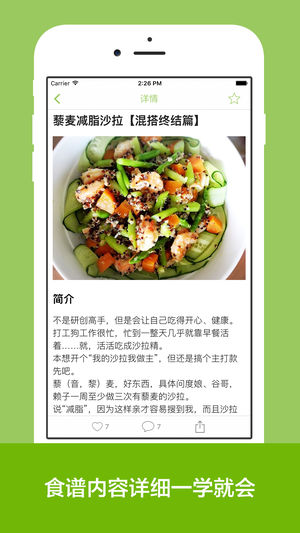 瘦身沙拉App,减肥的妹纸必备食谱,让你越吃越瘦! 产品特点: 1、超详细的使用工具、所需食材、步骤图示,让你零失败的走入厨房世界。 2、实用的操作技巧,包括食材介绍、选购、保存方法等优质内容。 3、发现并收藏喜欢的食谱,想做的时候就能在收藏夹里看到。