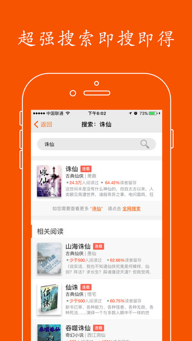 《免费小说大全》是一款小说阅读App,网罗天下经典流行小说,藏书100万+,并对所有书籍做了精准分类:武侠、穿越、科幻、历史、言情、校园、恐怖、科普、人文、教育、技术、经典名著等您能想到的这里应有尽有,并且集成了强大的搜索功能,方便您查找需要的书籍,并能对喜欢的书籍进行下载、收藏、评论......更多功能,欢迎下载体验! 备注:完美支持导入txt电子书!