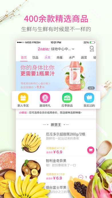 优质生鲜,2小时到。 下载注册即送新人专享优惠。 为了全方位满足吃货的需求,我们的商品已经涵盖了水果、肉蛋、水产、蔬菜、饮品、乳品、零食、轻食、粮油等9个品类, 是2,000,000吃货值得信赖的选择。 【产地直采】精选全球优质食材 资深食品买手团队常年在美国,智利,南非,澳洲等多个产地深入探索,只为把适宜的气候条件和地理环境下的优质食材送到您餐桌 【严格品控】我们知道,您的选择意味着信任。 每一款食材都要经过严格的筛选,只有合格率超过90%的食材才能入库进行第二次挑选。对每一道环节的严格把控,只为不负您的信任。 【2小时极速达】新鲜不应长久的等待 除华北、华东、华南三地分选中心外,我们已在全国8个城市建立了165个社区配送中心,保证站点辐射3公里内的用户,全部 配送过程由自有人员完成,保证2小时将美食送到您手上。 【全程100%冷链体系】新鲜需要更专业的保障 我们拥有冷库总面积最大的专业冷链物流体系,分三大温区保存食材,覆盖整个运输及储存过程。从 产地到舌尖,给您最原始的新鲜。 【一站式购齐一日三餐】400余款5星级精选食材,每周至少30款新品上新 我们用心挑选,只为您所见的每一款商品,都是精品。