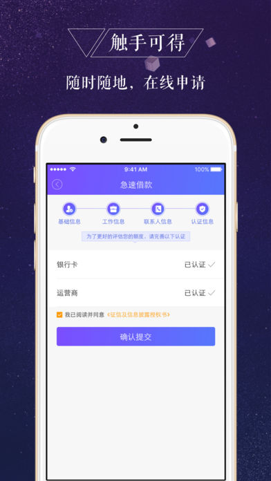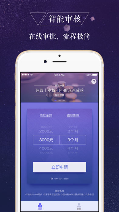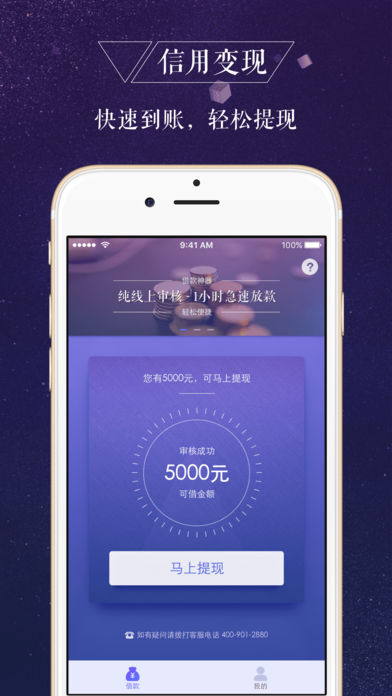 【产品特色】 申请条件:20-60周岁(非在校大学生),有二代身份证,个人信用情况良好。 智能风控:大数据智能风控系统,实时在线校验,满足条件者最快1小时急速放款。 易操作:随时随地轻松申请,在线流程易操作。 快周转:小额分散,1000-5000元额度,借款周期1-6个月。 【关于一信贷】 一信贷一款服务于个人、纯线上申请、小额快速借款服务中介平台,基于移动互联网和大数据风控等技术,坚持科技驱动金融创新,为广大用户提供全新的互联网小额信贷中介服务。申请简单方便、结果反馈迅速、还款方式灵活的特性,共享生态、信用极速变现的理念更是满足用户消费升级的多方位需求。 【联系我们】 客服电话:400-901-2880 【兼容性】iOS 8或更高版本、iPhone 5 以上机型。