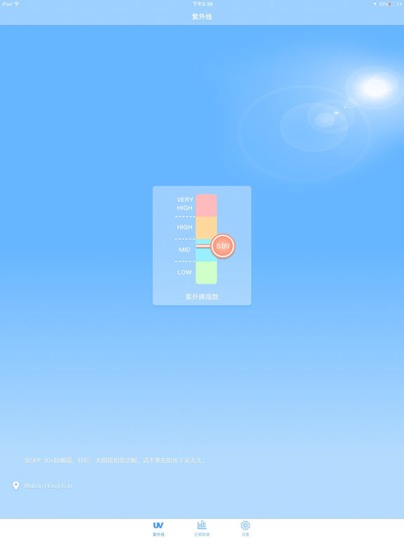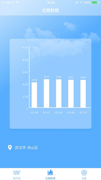 紫外线监测是一款测量紫外线强弱的app 皮肤过量暴露在紫外线中会导致晒伤和眼睛伤害,例如皮肤癌和白内障等 使用紫外线监测,测量实时的紫外线指数,帮助你掌握天气情况,即使做好防晒措施 ***主要特点*** 1. 紫外线指数分等级进行显示,辐射强弱一目了然 2. 提供紫外线指数折线图,包括过去两天的历史记录,当日紫外线指数以及未来两天的紫外线情况预测