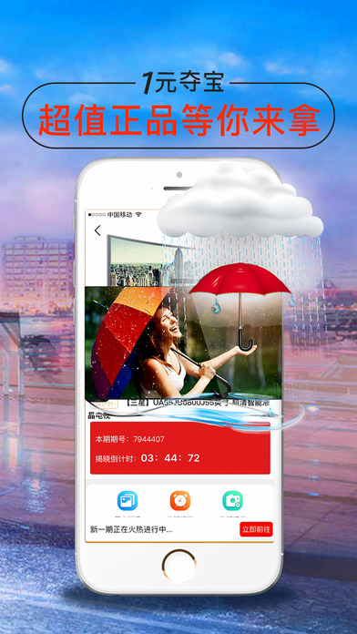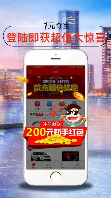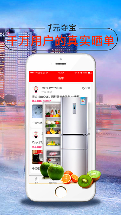 一元夺宝,一种全新的电商购物和娱乐体验,只需要花1元钱就有机会获得时下诸多的热门商品,潮流商品,玩法创新,欢乐无限,体验不一样的购物乐趣。现在下载一元夺宝,立即体验全新的一元购物! 【玩法新颖】 每件商品您只需要花1元钱,就有机会获得超级大奖! 【公平公正公开】 所有用户1元起购【公平】,根据全站最新50条参与时间记录计算幸运夺宝码【公正】,揭晓过程和计算公式透明可查【公开】。 【紧张刺激的等待过程】 参与一元夺宝,体验前所未有的紧张刺激,更有机会享受到获奖的超级乐趣! 【和朋友分享喜悦】 查看其他用户的晒单分享,见证他们在一元夺宝收获的喜悦! 一元夺宝-掌上秒杀神器,一元零钱欢乐购,一元夺宝热门特惠特卖正品,红包返利送不停,海淘折扣逛街的省钱助手 (特别声明:本应用所有活动与内容跟苹果公司无关)