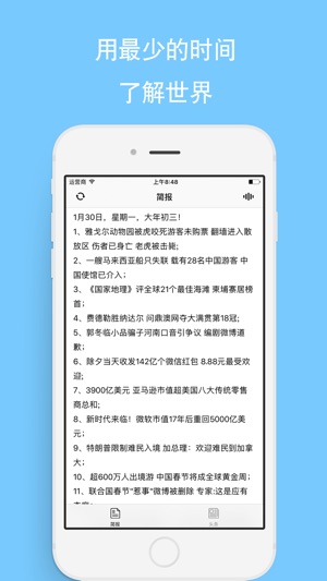 今日简报是一款简洁的新闻APP,用最少的时间了解世界。 1.每天一份简报,一键语音朗读。 2.国内头条实时更新。