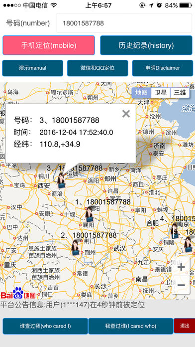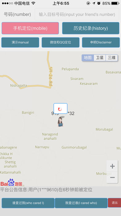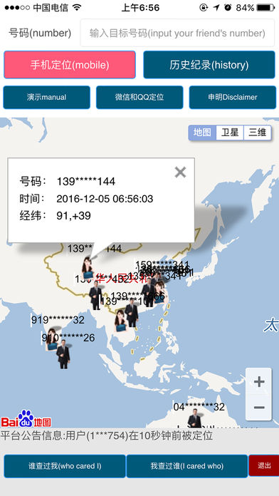本软件免费下载和使用。 首先郑重申明:请不要去做什么不合法的事情,否则我方不承担责任。本平台主要用于找回家人(比如反传销,找回被骗入传销组织的家人,或者监管幼小儿童的安全问题) 我方软件的本意是方便您关注家人和朋友,查询对方位置,以便确保家人和朋友安全,或者在对方迷路时找到位置领回。 所以请您以正当方式使用。如果您使用本软件过度侵犯了陌生人的隐私,并且在对方完全不知情的情况下给对方造成了实际的损失,需要承担责任,我方在此做善意提醒,因为本软件平台的初衷只为关护家人。 本软件很小,只有几M,不会占用您太多的内存空间。 系统是利用gps结合卫星,另外在地图上对原始数据进行二次处理及时纠偏的原理实现的位置确认功能。 功能: (1) 在手机丢失时,如果本手机安装了本软件,只要软件在运行,可以联系我方客服通过网页网页查询手机位置,尽量增加手机被盗和丢失的挽回机会。 (2) 定位对方实时位置 (3) 查询对方历史位置 (4) 回溯自己的定位记录 ********************** 启动时出现一个转圈是正常的,一般等待30秒后转圈就会自动消失然后可以点击操作。但苹果手机如果长时间转圈还没消失,并且地图是灰色界面的话。则做2个事:首先,设置网络连接(确保流量和wifi都给这个软件打开了权限); 然后:并且双击home键杀死软件重运行即可,实在不不行可重启手机。 ************************ 如果使用过程中有任何问题,可联系我方客服qq(在app内部可以看到我方客服号码)。如果对使用方式有疑问、或者对功能有质疑,及时联系我们,我们客服有可能不在线,您可以线留言,但她肯定会在半个工作日之内给出答案并协助您解决。 谢谢,希望这软件对您有用。 This software is free to download and use. First of all, please do not do anything illegal, otherwise we will not accept responsibility. This platform is mainly used for retrieving family members (such as anti-pyramid sales, retrieving family members who have been tricked into pyramid selling organizations, or supervising the safety of young children). The purpose of our software is to make it easy for you to pay attention to your family and friends, to check the location of each other, to ensure that your family and friends are safe, or to find your way back when you are lost. So please use it in a proper manner. If you use this software excessively violated the privacy of strangers, and on the other side completely unbeknownst to the actual loss caused to the other party and need to take responsibility, we do kindly remind here, because this software platform designed for care family. The software is small, only a few M, and won't take up much of your memory space. The system USES GPS to combine with satellites, and the location recognition function of the principle of timely rectifying the original data on the map is implemented. Function: (1) in the mobile phone is lost, if this mobile phone to install the software, as long as the software running, you may contact our customer service through a web query mobile position, increase the chance of mobile phone was stolen and lost to save as much as possible. (2) locate the other person in real time (3) check the historical location of each other (4) backtrack the location record * * * * * * * * * * * * * * * * * * * * * * * It is normal to have a loop when it starts, normally waiting for 30 seconds, then it will disappear automatically and then click on the operation. But if the iphone doesn't disappear for a long time, and the map is gray. Do two things: first, set up a network connection (ensure that both traffic and wifi have access to the software); Then: double-click on the home button to kill the software and restart the phone. * * * * * * * * * * * * * * * * * * * * * * * * * * * * * If there is any problem in the process, we can contact our customer service qq (we can see our customer service number inside the app). If you have any questions, or the use of the function have question, contact us in time, our customer service may not online, you can leave a message line, but she is sure to give the answer within half a day and help you to solve. Thank you. I hope this software works for you.
