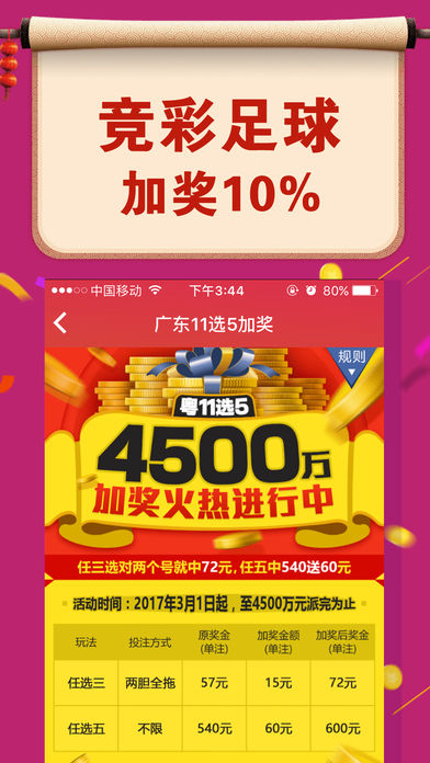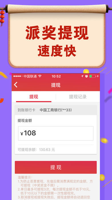 ------「会员专享福利」------ 【新人礼包】注册即送88元,人人有份! 【每日签到】彩票、红包、优惠券免费领,更有壕礼等你来抽取! 【加奖活动】高频彩加奖高达10%,中得越多奖的越多! 【呼朋唤友】亿元红包来就送,邀请好友奖不停! ------「体彩大乐透特色」------ 【鸿运当投】涵盖热门彩种,摇一摇走上人生巅峰! 【开奖最快】中奖信息光速传递,幸福生活不能等! 【截止最晚】时间更充裕,大奖不怕迟! 【安全有效】真实出票,线上下单,线下出票,兑奖保证! 【功能齐全】智能追号、奖金优化、走势遗漏、比赛数据,助你精准投注! 【活动丰富】注册送、充值送、加奖、不中送,超多特惠等你来体验! (注:以上活动奖品与苹果公司无关)