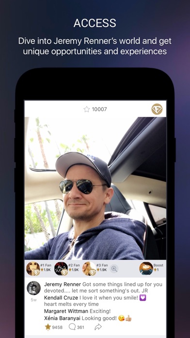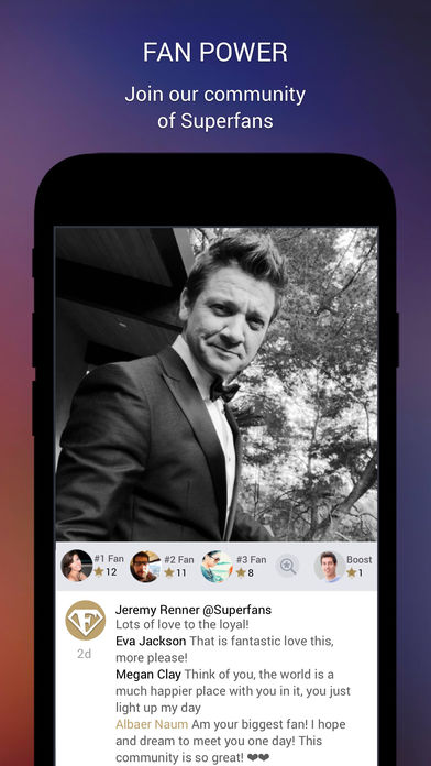 Follow Jeremy Renner through his Official App smarturl.it/JeremyRenner. Download the free Jeremy Renner app now! Stay connected to Jeremy Renner on his official app. Do fun things: - Check out the in-app social feed for live updates and videos. - Boost your comments with Superstars, become a Top 3 Fan, and be seen by Jeremy Renner. - Join exciting contests for a chance to win amazing prizes like meeting Jeremy Renner, event tickets, and more… - Watch cool videos. - Follow Jeremy Renner on social media. - Listen to the FREE built-in playlist and add more songs from your personal library, Spotify. Download the Jeremy Renner app now and #BeSeen! We’ve just launched subscription service! Subscribers will get the exclusive subscriber badge to decorate their avatars and help them be seen, as well as exclusive content just for them. The $2.99/month subscription fee will be charged through your iTunes account as an auto-renewable, recurring transaction unless you cancel your subscription before the end of the current subscription month. You can manage your subscription, cancel it, or turn off auto-renewal at any time by accessing your iTunes account. Privacy Policy and Terms of Use: https://www.escapex.com/legal About Jeremy Renner Jeremy Lee Renner (born January 7, 1971) is an American actor and singer. Throughout the 2000s, Renner appeared largely in independent films such as Dahmer (2002) and Neo Ned (2005). He also appeared in supporting roles in bigger films such as S.W.A.T. (2003) and 28 Weeks Later (2007). He then turned in a much-praised performance in The Town (2010), for which he received an Academy Award nomination for Best Supporting Actor. Renner is best known for his roles in The Hurt Locker (2008) for which he received an Academy Award nomination for Best Actor, and for playing Hawkeye in the Marvel Cinematic Universe films Thor (2011), Marvel's The Avengers (2012), Avengers: Age of Ultron (2015) and Captain America: Civil War (2016). He also appeared in commercially successful films such as Mission: Impossible – Ghost Protocol (2011), The Bourne Legacy (2012), Hansel and Gretel: Witch Hunters (2013), American Hustle (2013), and Mission: Impossible - Rogue Nation (2015).