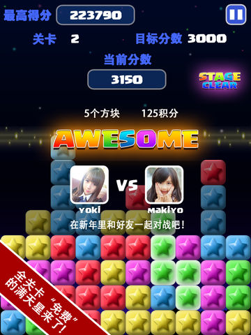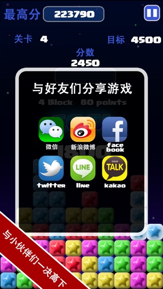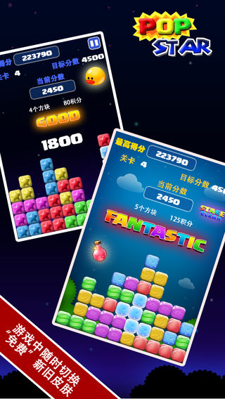 中国区游戏下载量TOP10的popstar满天星又回来啦!与你一起度过2014新年!画面和可玩性优于市面上任何一款同类游戏,你还在犹豫什么,免费的全关卡,免费的神奇宝石道具,赶快拿起你的手机下载吧,一起来挑战最高分! 特色: 1.无关卡限制,自动保存。 2.无广告条,玩的顺畅爽到爆! 3.最炫酷的游戏画面。 4.完全免费 2.每天登陆有免费的宝石赠送 3.优秀的画面与生动的音效 4.与好友一决高下,支持微信,微博等社交平台 5.支持中文字体显示 您的需求就是我们不断前进的动力! 欢迎关注TinyGame的官方微博 http://weibo.com/tinygame [TinyGame Studios] [support@tinygame.cn]