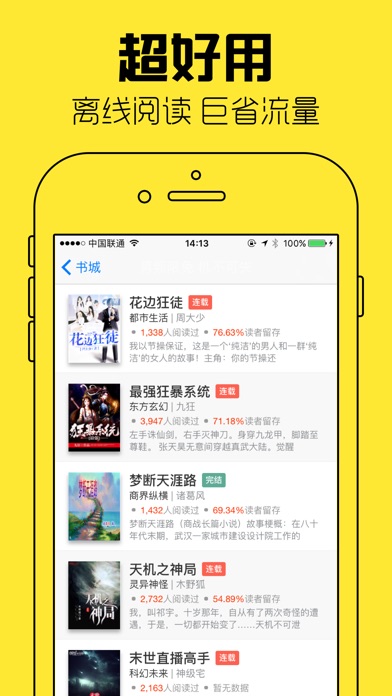 全本免费小说书城,每天用先进的技术,敏锐的嗅觉,飞快的速度为您精选各大网站最新,最热,最全的小说,拥有最及时的连载更新提示,拥有海量的书源,拥有完美的用户体验,是一款让您爱不释手的小说下载阅读器。 产品主要特点: 1.实时监测:强大的智能监测引擎,为您实时监测关注小说动态,让您第一时间得到最新小说更新章节提醒。 2.简单易用: 改进了传统小说阅读器中多种细节,对于每一个细节,我们都力求最易用,给您完美的用户体验。 3.丰富书源:支持国内各大热门网络小说网站,书源网站不断增加,满足您的所有阅读需求。 4.即点即看: 支持下载阅读和在线阅读两种模式,在线模式让您节省更多硬盘空间,拒绝等待,一点即读。 5.智能书签:不需要您人工操作,系统自动记录您的阅读位置,根据您的阅读习惯,自动排序您的书籍。 6.完美体验:精排的文字,多种阅读配色方案,流畅的翻页,最重要的是永不闪退的稳定。