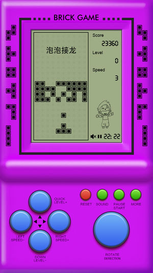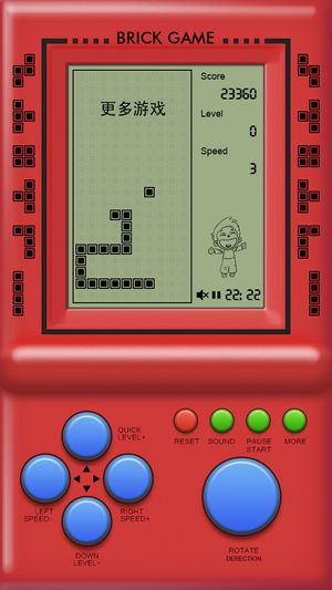 重拾童年的记忆,向方块发出新的挑战吧! 只因童年时我在别人的手里看了你一眼,你却亮瞎了我的钛合金狗眼。梦想着能有一天再拥有你 — 经典方块掌上游戏机,你一直在我身边从未走远。 经典方块游戏,没有玩过就没有童年! 不因寂寞,只为童心,等你来! • 打飞机(歼落陨石) • 打飞机(超级战机) • 打飞机(飞越峡谷) • 泡泡龙 • 贪吃蛇 • 坦克大战 • ... [ 温馨提示 - 如何切换游戏 ] 请先点“RESET”,回到启动画面,然后点击右下角那个很大的“ROTATE”按钮,就可以选择游戏了。选好后,点击“START”即可开始游戏。