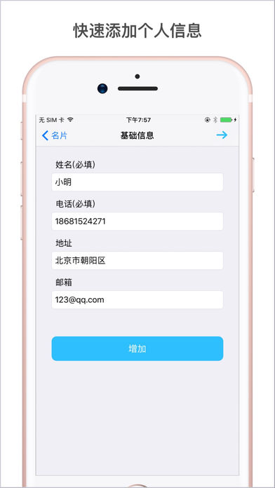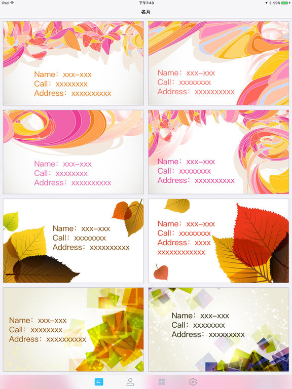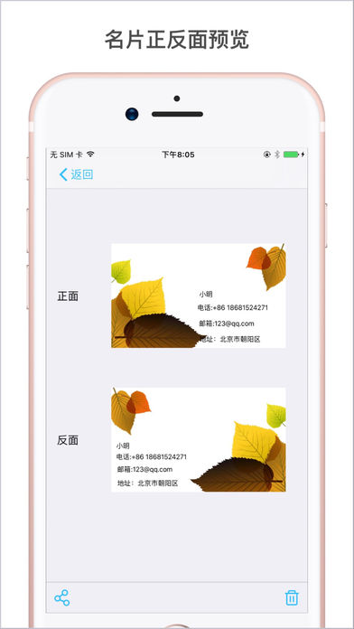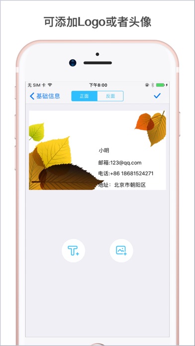 免费制作个性化名片 *你只需要提供姓名、单位、电话号码、邮箱、地址、logo、头像等信息,就可自动生成好看的名片 *多种精心设计的模板可供选择,你也可以自定义名片背景 *将你的电子名片以图片的形式发送给别人或打印出来