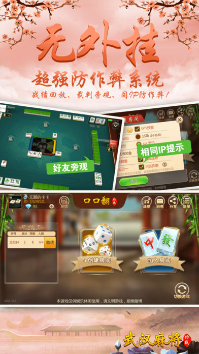 ~~~游戏介绍~~~ 【最刺激】刺激的开口番、口口翻,胡牌爽翻天,更有单独的卡五星玩法哦。 【最稳定】大厂出品,确保游戏过程更加稳定,专心玩游戏,没有掉线卡顿烦恼。 【最好玩】再也不用苦于配桌,全民手机时代,你可以再手机上随时随地和亲朋好友搓麻将,是传统麻将馆的有力补充。和亲朋好友一起开房,决一高下吧! 【最靠谱】可以录像回放,同IP报警,杜绝外挂,真实可靠。 【最智能】智能提示、界面大方更具人性化,支持智能单独、分开支付房费。