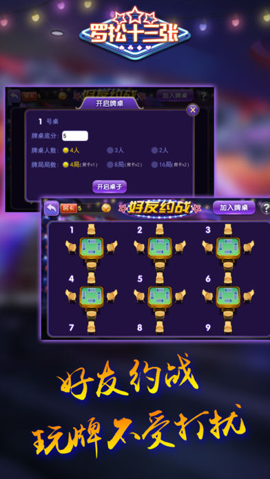 【罗拼十三张】是一款考验玩家智慧、勇气和策略的益智类博弈扑克牌游戏,主要流行于江苏、上海、浙江、福建、江西、山东一带,也称为十三水、十三道、十三支、罗松和拼罗松等。具有开房间、召唤好友、邀请好友对战等社交娱乐功能。一副牌(除去大小王),2~4人游戏,每人13张牌。玩家把13张牌分别以头、中、末道同时摆出来比较大小,确定胜负,注意出牌时,第一墩 < 第二墩 < 第三墩,未按照此规则出牌者视为相公。其中的牌型有:同花顺、炸弹(四条)、葫芦、同花、顺子、三条、两对、对子和乌龙(散牌)等,是一款正宗、流行、传统玩法的手机益智游戏。