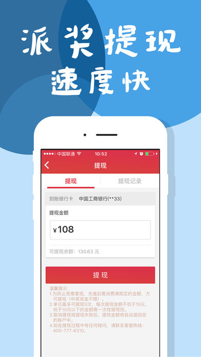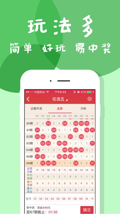 ------「会员专享福利」------ 【新人礼包】注册即送88元,人人有份! 【每日签到】彩票、红包、优惠券免费领,更有壕礼等你来抽取! 【加奖活动】高频彩加奖高达10%,中得越多奖的越多! 【呼朋唤友】亿元红包来就送,邀请好友奖不停! ------「11选5特色」------ 【鸿运当投】涵盖热门彩种,摇一摇走上人生巅峰! 【开奖最快】中奖信息光速传递,幸福生活不能等! 【截止最晚】时间更充裕,大奖不怕迟! 【安全有效】真实出票,线上下单,线下出票,兑奖保证! 【功能齐全】智能追号、奖金优化、走势遗漏、比赛数据,助你精准投注! 【活动丰富】注册送、充值送、加奖、不中送,超多特惠等你来体验! ------「覆盖更多彩种」------ 高频彩(加奖):广东(粤)11选5,新(新疆)11选5,山东(鲁)11选5,云(云南)11选5 竞技彩(加奖):竞彩足球,竞彩篮球,北京单场,竞彩单关,胜负彩 数字彩:双色球,大乐透,福彩3D,七乐彩,七星彩 (注:以上活动奖品与苹果公司无关)