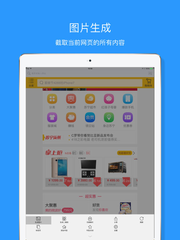 ==最后一天半价!赶快下载吧!== 支持iOS 10! 【产品特点】 1.对喜欢的网页内容一键全部截图 2. 一键生成二维码 3.提供无痕浏览网页 4.书签与历史快速差查找网页 5.标签页快速切入目标网页