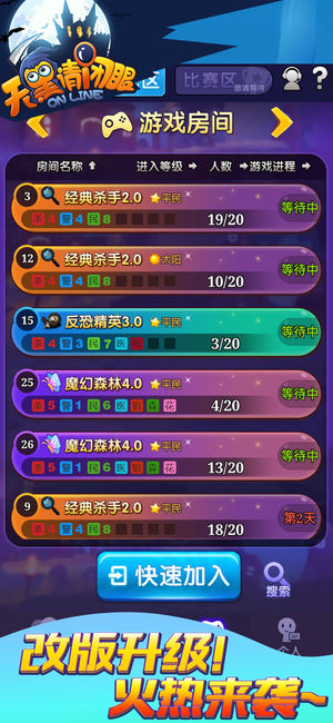 叫杀人游戏online,是一款集逻辑推理、社交休闲、口才较量、分析判断为一体的手机在线杀人游戏。(这是一个炒鸡棒的游戏啊!) 【游戏特色】 ---逻辑推理,口才较量! 这是一款既需要判断又需要演技的大型杀人游戏。拿出你的逻辑,你的口才,来演绎一局精彩的天黑请闭眼游戏吧!带着你的推理,你的分析在游戏中一展风采吧! ---一战成名,独坐巅峰! 游戏中独特的排行榜功能,让您高超的游戏能力得到全服玩家的认可;高人一等的魅力值让您成为万中挑一的男神,女神!在畅快游戏的同时体验到被玩家崇拜的快感! ---真实社交,婚姻系统! 可以结婚辣!~ (≧▽≦)/~啦啦啦!游戏中不但可以创建家族和好盆友一起结伴玩…