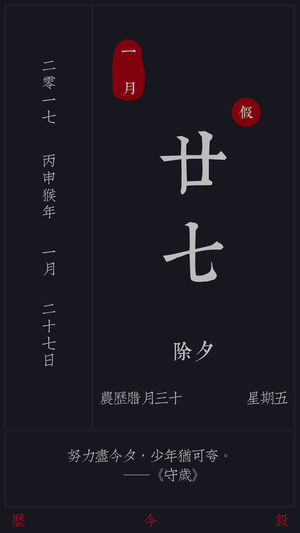 素历是素记团队推出的一款日历app。 整体运用古风的设计风格,给使用者一种古典和传统的日历风格。 ●●●●●●●产品特性●●●●●●● 显示法定节假日 - 工作日节假日显示 显示农历 节气显示 - 不同的节气,底部显示对应节气的古诗 显示名言警句 显示优美诗词 夜间模式 联系我们:suliapp@163.com 如果您喜欢素历,希望可以给我们一个好评。