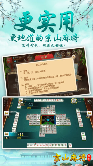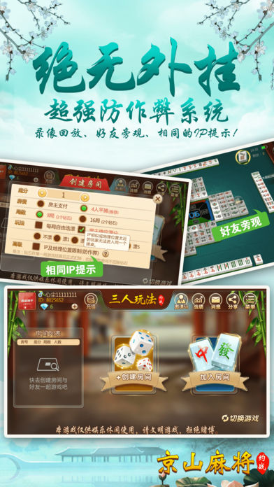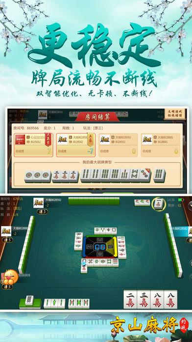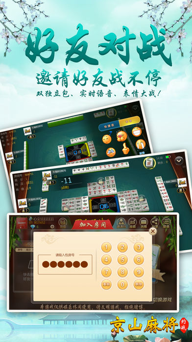 京山人民期待已久的包房麻将震撼出世! 【最刺激】 刺激的三人麻将、四人麻将,再也不用三差一啦!还有地道的方言配音,要玩就玩京山人自己的麻将! 【最稳定】 大厂出品,确保游戏过程更加稳定,专心玩游戏,没有掉线卡顿烦恼。 【最好玩】 再也不用苦于配桌,全民手机时代,你可以再手机上随时随地和亲朋好友搓麻将,是传统麻将馆的有力补充。和亲朋好友一起开房,决一高下吧! 【最靠谱】 可以录像回放,同IP报警,杜绝外挂,真实可靠。 【最智能】 智能提示、界面大方更具人性化,支持智能单独、分开支付房费。