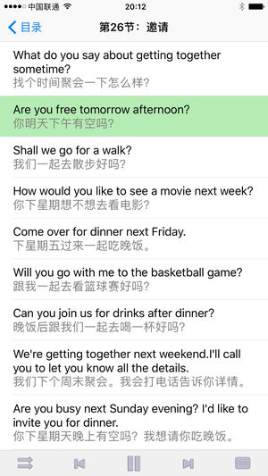 轻松学英语让您轻轻松松学英语。 本软件将基本语法的学习穿插于句子的学习之中,并设计了实际运用的场景对话,方法科学,内容生动,侧重于教您学会英语基本会话,其内容涵盖历史、经济、文化等方面的小常识及日常生活,社会交往各个方面。 包含美语会话之闪电速成、100个常用句型、情景会话、高级进阶四大板块。 支持文本音频同步朗读,点击句子发音,滑动控制进度,锁屏之后继续播放,中文讲解,更多精彩内容请下载体验。