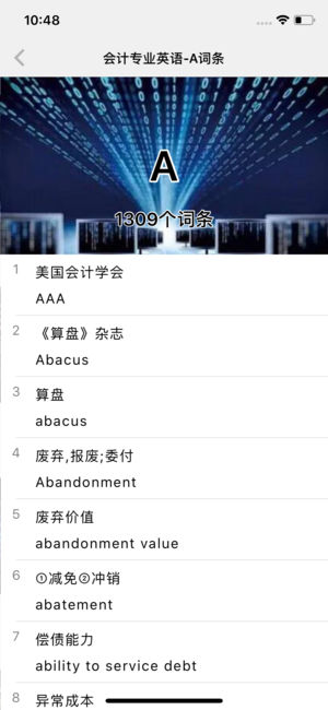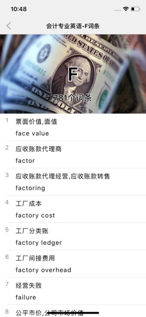 会计专业英语词汇大全,内容包括了(1)会计名词词汇,(2)常见会计科目词汇,(3)国际会计词汇,(4)财经等会计词汇,总计词汇量16000多条。 支持离线查询,支持中英文查询,支持单词收藏。 使用iOS原生功能开发,非嵌入网页,操作流畅,界面清新,交互友好。