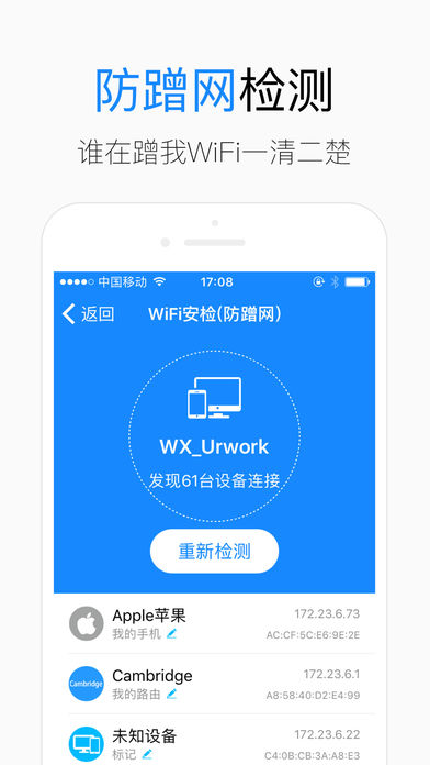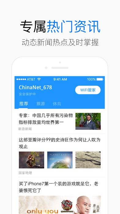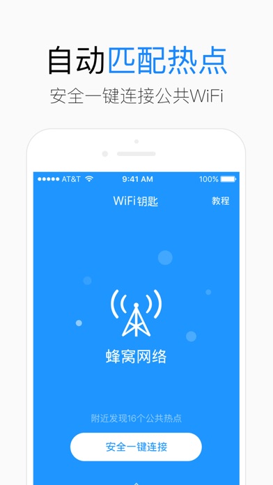 【产品简介】 WiFi钥匙通过地理定位,自动搜索周边商家wi-fi,已累计为用户覆盖了全国超过100000000的WiFi热点,iOS9系统一键连接功能上线,用户无需截图即可实现一键连接wifi。WiFi钥匙致为用户提供更加安全的上网环境,接入中科院旗下资金的投资,在安全防控体系,保护用户的信息方面,更是国内领先的,是iphone手机用户安全连接WiFi的首选神器。 【产品特点】 特点一:免费连接WiFi 特点二:最全的WiFi热点地图 360度免费连接WiFi 特点三:神奇插件 打开应用快人一步