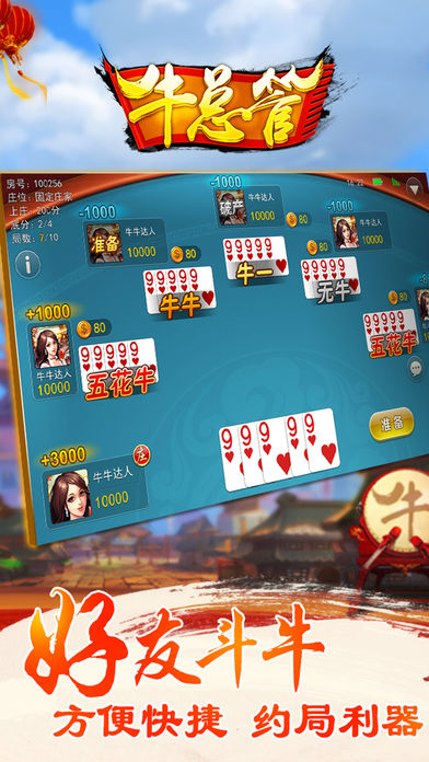 牛总管-众乐乐游戏全新打造精品游戏。还原地道斗牛玩法,节奏快速,规则正宗。随时随地,约上三五好友组局切磋,生活乐无穷! ********************游戏特色******************* 熟人之间的公平竞技 方便快捷的斗牛约局利器。大厂良心制作,无外挂,无内幕,经得起考验! 高游戏品质 整体节奏明快,结算透明,绝对让你欲罢不能!犹如身临其境,告别山寨高仿次品伤眼睛伤感情! 实时语音通讯,互动道具 游戏中您可以同家人朋友实时进行语音通话,也可以使用地道的快捷语,互动道具,氛围好的不要不要! **************更多精彩,等你来一探究竟*************