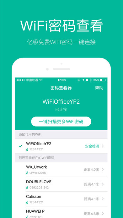 WiFi密码查看器是万能的WiFi密码管理工具苹果版,是白领、学生、商旅人士出行的必备工具。可以帮助用户查看各种公共场所共享的公共WiFi密码;还可以保存用户连接的历史WiFi密码;同时常见密码帮助用户更好地保护自己的密码安全。 附近密码依靠WiFi伴侣和WiFi钥匙的强大数据库支持,拥有全国上亿共享的公共WiFi密码及千万用户支持验证密码的正确性及安全性,为您安全上网保驾护航。 不同于热点连接工具,WiFi密码查看器是一款智能的WiFi密码管家,可以查看附近公共WiFi密码,同时保留历史连接过的Wi-Fi足迹及密码,一键连接WiFi不再是梦想。 ——————我们的特点—————— 附近密码,亿级公共WiFi助您一键智能上网; 历史密码,WiFi足迹快速找到连过的WiFi密码; 常见密码,验证WiFi密码安全性安全上网。