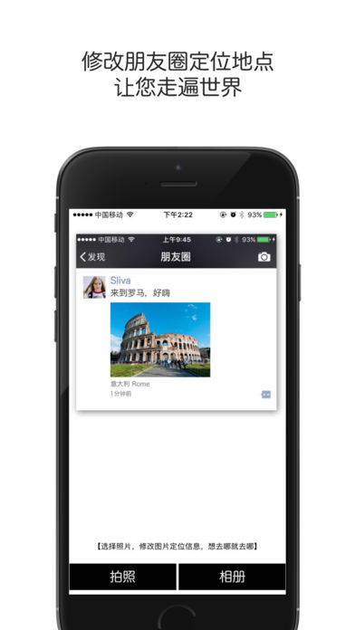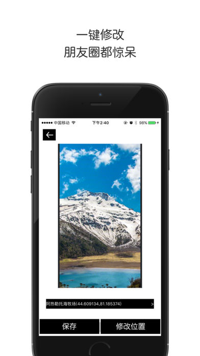 ***【今日优惠】百万果粉达人倾心推荐,各大站长期力荐。 ***只需一步,精准修改图片定位(拍摄地点)信息 ***修改GPS信息毫无破绽,立即引爆朋友圈 ====使用说明==== 1,选取需要修改的图片,或者在App内直接拍照获得。 2,一步操作修改想要的地点,App会自动保存新的照片到相册,不会覆盖。 3,发布社交平台时,“定位位置”就会的出现你想要的地点。 4,默默等待朋友的吃惊,点赞。 ====具体功能如下==== 1、修改照片的拍摄地理位置GPS经纬度; 2、定位当前图片位置,地图显示当前地理坐标; 4、在世界地图,任意选择想要修改的位置。 5、反地址编码,自动获取选取的地方附近热点。