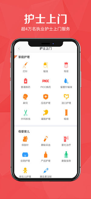 医护到家,是上市公司第一视频集团旗下品牌,面向全国用户,提供高品质有保障的居家护理服务。通过医护到家,可以随时预约周边医院在职护士,提供上门打针、输液、换药、采血等护理服务。 ===主打亮点功能=== 【护士上门】 √ ICCINO护士上门护理标准:由医护到家推出,国内首个通过ISO9001标准认证的行业标准; √ 30余项服务,全面满足需求: 打针、输液、孕妇护理、换药(含PICC)、吸痰、导尿、鼻饲、灌肠、雾化治疗、外科插线、压疮护理、造口护理、产后护理、新生儿护理、护士催乳等; √ 超4万名医院在职护士:严格的护士准入机制,正规三甲医院护士,国家卫计委认证,随时为您提供上门护…