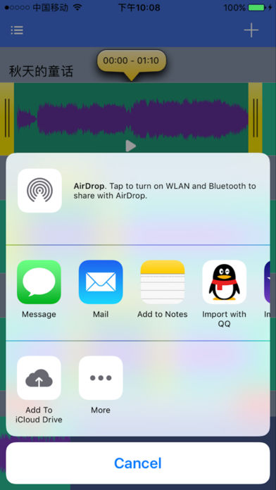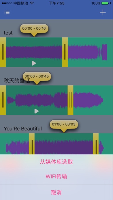 快速方便裁剪音乐音频,对多个音乐进行合成,能精确选择所需音乐时间片段,制作串烧音乐、进行音频编辑、处理的必备软件。通过长按音乐块来拖动到音乐编辑区域即可编辑。 特色: 1 支持从媒体库选取音乐。 2 支持在同一局域网下通过WIFI从电脑传输音乐到手机,可同时传送多个音乐文件。 3 导入的音乐可在音乐列表查看,方便以后使用。