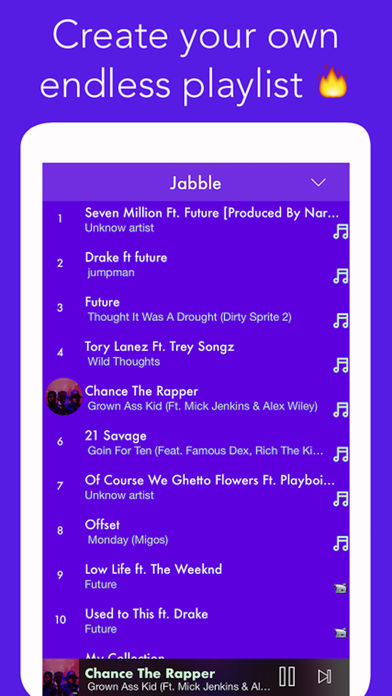 Explore all your favorite artists, songs & videos with Jabble! Create an endless playlist of all your favs to stay entertained for hours, with NO ADS! Please visit http://www.jabbleapp.com for more info - Subscribe to Jabble and listen to all mixtapes, songs & videos. Create an endless/ad-free playlist of all your favorites. - Subscription is $1.49 USD* - All prices are subject to change without notification. We occasionally run promotion prices as incentives or limited time opportunities for qualifying purchases made during the promotional time period. Due to the time sensitive and promotional nature of these events, we are unable to offer price protection or retroactive discounts or refunds for previous purchases in the event of a price reduction or promotional offering. - Payment will be charged to iTunes Account at confirmation of purchase - Subscription automatically renews for the same price and duration period as the original one week subscription unless auto-renew is turned off at least 24-hours before the end of the current period - Account will be charged for renewal within 24-hours prior to the end of the current period at the cost of the chosen package (weekly, monthly or yearly package) - Subscriptions may be managed by the user and auto-renewal may be turned off by going to the user's iTunes Account Settings after purchase - No cancellation of the current subscription is allowed during active subscription period - You may cancel a subscription during its free trial period via the subscription setting through your iTunes account. This must be done 24 hours before the end of the subscription period to avoid being charged. Please visit http://support.apple.com/kb/ht4098 for more information - You may turn off the auto-renewal of your subscription via your iTunes Account Settings. However, you are not able to cancel the current subscription during its active period - Any unused portion of a free-trial period, will be forfeited when the user purchases a Jabble subscription Privacy Policy: http://www.jabbleapp.com/privacy-policy Terms of Use: http://www.jabbleapp.com/terms-of-service * Prices are equal to the value that Apple's App Store Pricing Matrix determines as the equivalent of the subscription price in $ USD