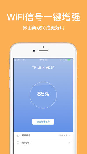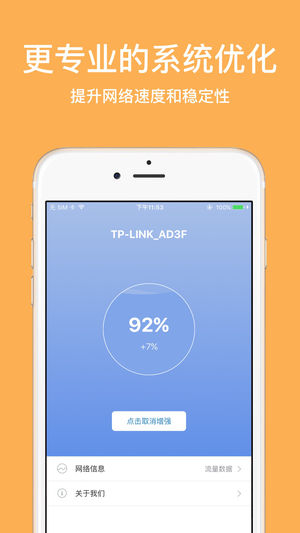 == 有言在先 == 因为不喜欢内置广告,给大家带来困扰,所以选择设置成收费,费用绝对良心,功能真实有效,希望大家能够多多支持~ == 产品简介 == WiFi信号增强器是一款专业的信号增强工具,通过优化系统底层模块来优化网络效率,使硬件可以处于最优的环境中工作,能使您的网络信号提升5-30%左右并且提升网络的稳定性,是您必备的网络小工具。 ==【产品特点】== 1. 一键增强信号,提升网络速度和稳定性 2.优化硬件性能,保持网络畅通稳定 3.详细的网络信息,更有网络速度检查,让您更好的监测您的网络使用情况