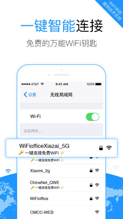 此版本为WiFi钥匙专业版,购买此版本可以享受WiFi钥匙所有的连接功能和密码服务,同时可以享受轻量应用和无广告的使用体验。是一款免费连接WiFi的上网神器,是生活中的WiFi伴侣!作为一款WLAN管理工具,WiFi钥匙内含千万热点,让你体验360°免费WiFi,畅游互联网。并且操作简单,一键点击就可解锁所有WiFi,轻松实现自动联网,,再也不用烦恼流量不够用,不再向电信,移动加流量包。另外万能的WiFi钥匙内置WiFi密码,无需在百度询问密码,更不需要上微信发朋友圈询问密码。 ——————我们的特点—————— 【免费WiFi】亿级免费WiFi,随时随地免费上网 【轻量应用】专注于解锁不含多余内容,轻装上阵 【拒绝广告】无广告、一键智能连接WiFi