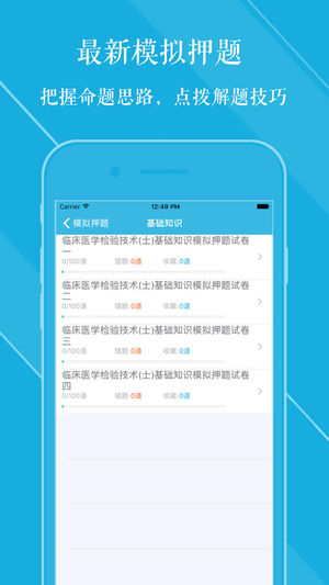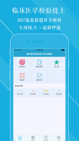***免费获取下载码-关注微信公众号:woyaotest(我要考试官网) 本软件适合于2017年全国卫生专业技术资格考试,临床医学检验技术 初级(士)考试专业,专业代码105,精心准备了考试题库,每一道试题都有答案解析,为考试的提供了充分的复习准备,可随时随地学习练习,有效帮助顺利通过考试,学习知识通过考试必备神器! 【功能介绍】 1、专项练习:强化练习习题,每一道题目都有详尽的解析,可选择不同题型,并可将易错或未牢固掌握的题加入复习库和错题库,以便反复练习。 2、错题库:可自动加练习过程中错题加入收藏,以便反复练习。 3、收藏库:可在练习过程中自行收录题目到收藏库,形成自己的小题库,…