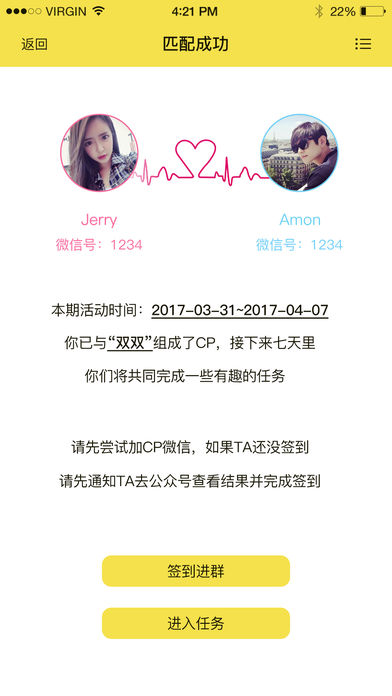 我们不是狗粮的搬运工,我们只是狗粮的制造商。 如果你整天忙于工作,没有时间出去社交; 如果你的朋友圈太小,兔子已没有窝边草; 如果你也想找个人陪,却不愿意随便将就; 如果你不好意思相亲,还担心会遇到极品; …… 欢迎来到【7天CP】,给自己一个机会,遇见未来的美好 使用指南: 只要你是单身!单身!!单身!!! 四海八荒的单身狗们将根据合适的条件组成CP在微信房间内度过美好而奇妙的7天,共同完成简单温馨的线上任务,任务不超过半小时,不影响正常的工作和生活 在任务中熟悉彼此,在真诚中倾诉彼此,在缘分中找到彼此 7天之后的你们能继续在一起制造狗粮那是再好不过, 成为知己好友也是不可多得的缘分, 如若相忘于江湖也算是给自己的未来做了一道减法,让自己的未来更加清晰一些 我们是可爱又迷人的正经APP,想做不可描述事情的反派角色出门随便左转或者右转不谢 欢迎关注微信公众号:7天CP