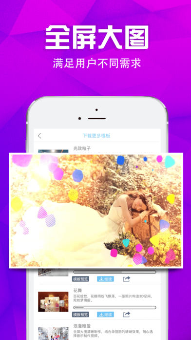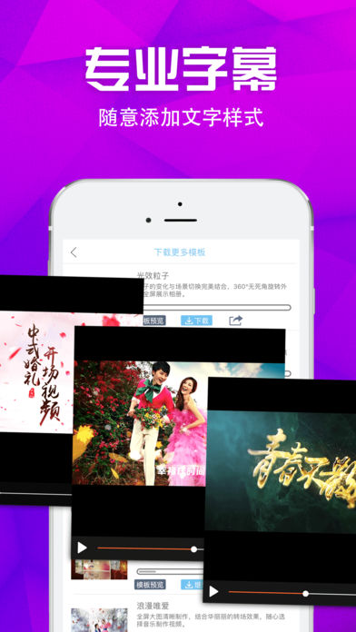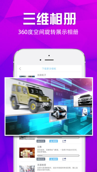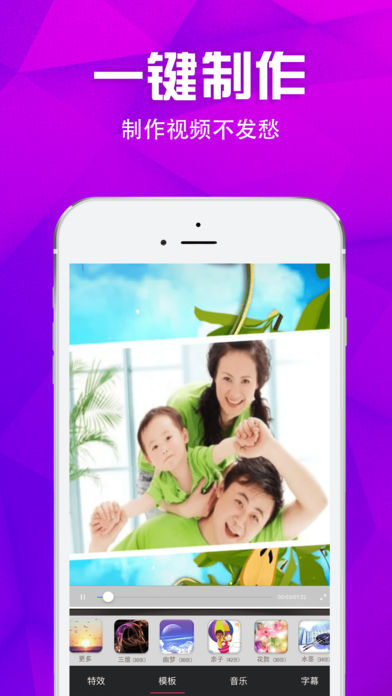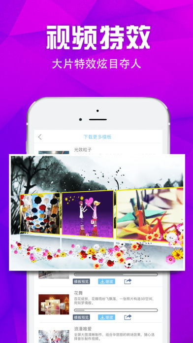*颠覆视频制作玩法,制作属于你的专属个人视频相册! *3D立体画面,360°多视觉用户体现效果,独创新颖,前所未有! *多个社交平台分享,引领时尚新风潮! 美圖視頻制作,是一个功能强大的视频制作软件,具有多种视频模板选择,只需简单几步就能制作精美的视频,能实时看到视频效果,生成导出视频只需十几秒的时间,支持分享到各大微博,导出到相册,WiFi导出(电脑查看更清晰),是最好用的视频制作分享app。 【个性模板】 丰富的模板选择,自动让视频呈现不同风格! 【绚丽特效】 十几个特效粒子,一键呈现惊艳效果! 【精美配乐】 精选不同风格的背景音乐,搭配视频更带感! 【字幕编辑】 为视频添加字幕,更好的表达视频意境! 【高清画质】 同类视频软件中画质最细腻,压缩最无损,给你绝无仅有的超清视觉体验! 【使用场景】 1.为您的另一半制作做一个示爱视频--收获爱情 2.为您的家人把生活的点滴做成视频--收集回忆。 3.为您的宝宝做一个成长视频--收集成长 4.为您的婚纱照制作专业的婚庆视频(可以和影楼的效果相媲美)--婚姻的见证 5.为您把生活中的照片做成动感精美的视频短片--我型我秀 6.为您的公司、产品、个人制作宣传片--自我营销