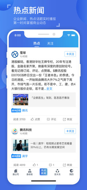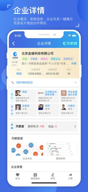 天眼查-查公司查老板查关系,更专业的企业信用信息查询平台,查企业就上天眼查。 天眼一下----让查人变得更简单,查公司变得更快捷。 查企业、查老板、查关系,查征信、查信用、找客户、谈合作、做调研,就上天眼查! 目标人物关系网任意查,想知道的公司信息随便找,百余种数据维度等你看。 关系梳理透明化,专业信用报告呈现等高阶功能,明星和老板们都在用,适用于所有人群。 天眼查实时洞察商业讯息,成功人士都在用的商业安全工具,下载天眼查APP免费查询。 【天眼查的特色功能】 使用便捷:无登录免费查询,不用强制注册即可使用查询功能 权威数据:数据信息与国家权威网站同步,实时更新 企业风险:预估企业…