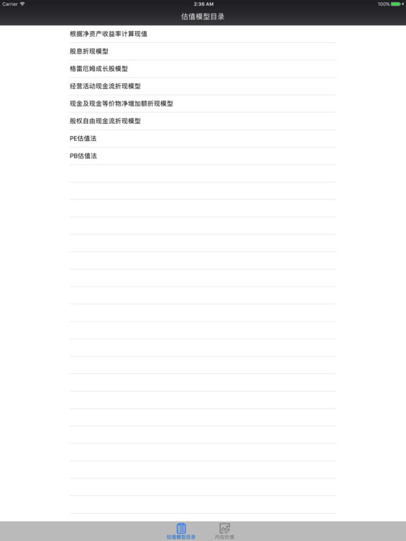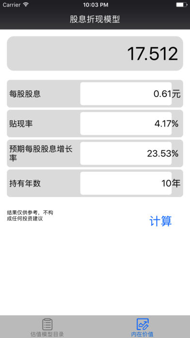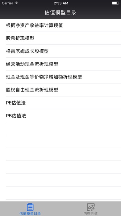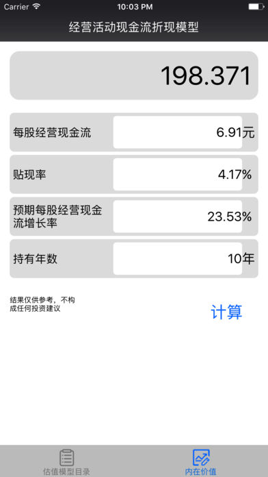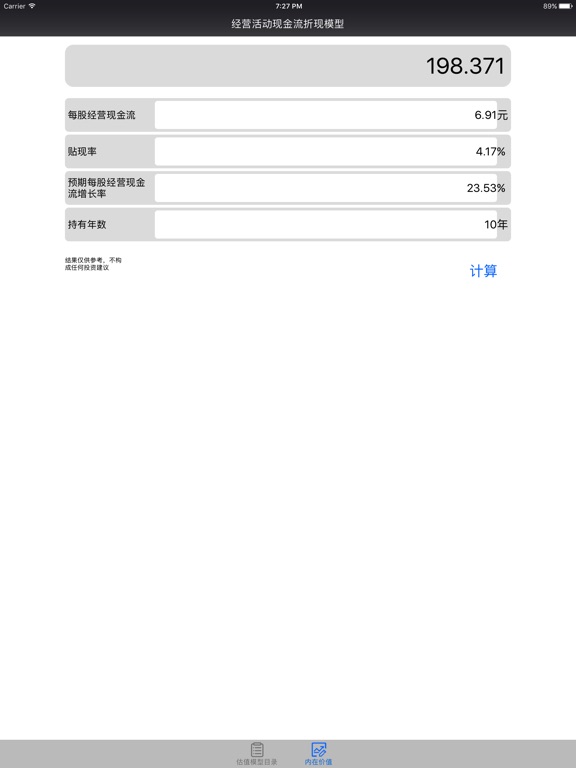 ~股票的内在价值是指股票未来现金流入的现值。它是股票的真实价值,也叫理论价值。股票的未来现金流入包括两部分,一是预期股利,二是出售时得到的收入。在实际的交易中,股票未必都会反映出自己的内在价值,它还受到市场情绪等因素影响。 ~本应用收集了各种不同的估值方法和模型。 ~用户可从公司财报中获取相关财务数据,便可运用应用内的各种估值模型。 ~结果栏中显示的是推算出的每股内在价值。 ~对股票的估值还应运用安全边际、护城河、核心竞争力、能力圈等理念。但毫无疑问,运用估值模型是股票估值中重要的一步。 ~本应用仅供参考,不构成投资建议。