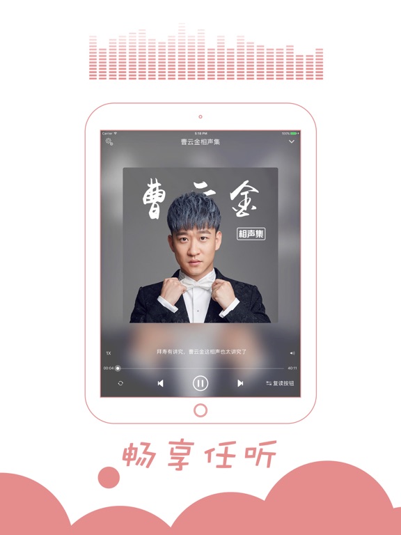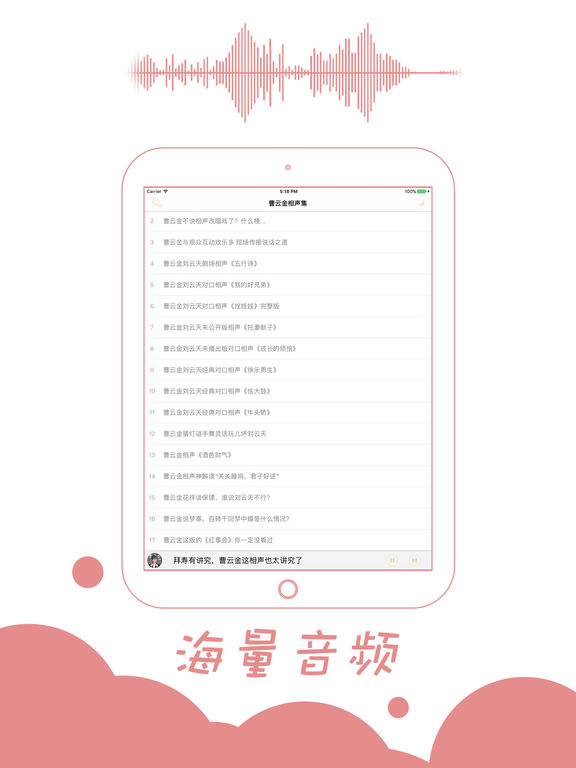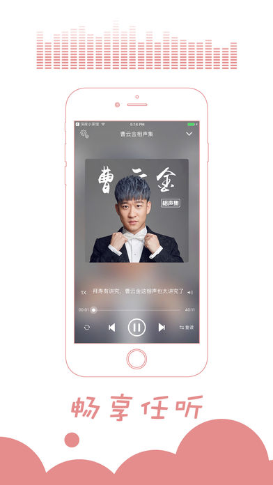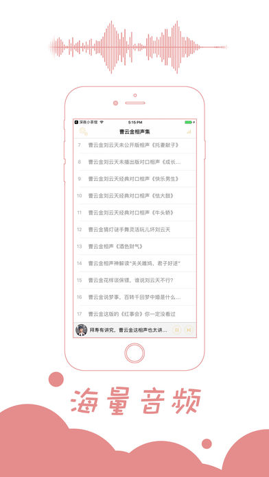 本应用为广大相声听众精心收集听云轩曹云金未公开版相声节目。 曹云金,原名曹金,1986年1月26日出生于天津,相声演员。2006年登台表演相声,后又涉足影视圈。2011年曹云金从艺十周年相声专场从北展开始。2012年获第七届曲艺牡丹奖新人奖。2012年9月24日,获第六届CCTV相声大赛最受欢迎相声演员奖。2012年、2013年和2014年连续三次登上央视春晚的舞台。2016年主演电影《不离不弃》。2016年10月20日,曹云金获得2016网易时尚跨界盛典年度最受关注喜剧演员大奖。 代表作主要有: 【托妻献子】【我的好兄弟】【成长的烦恼】【五行诗】【酒色财气】 【快乐男声】【拴娃娃】【红事会】【怯大鼓】【牛头桥】