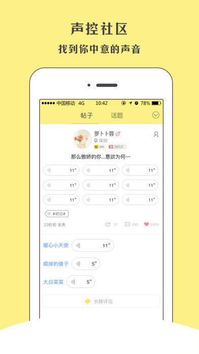 快声App是一款主打用声音交友的社交软件。 在这里有各种不同的声音,轻柔、可爱、气质、神秘、活泼等等,总有一款能吸引你。 社区里各种好玩的话题,让你边听边乐。 发现好玩的人可以加为好友,解锁更多功能。 【连麦】彼此用声音相伴,距离更近; 【你画我猜】好玩又有趣,迅速活跃气氛; 【真心话、私密话】有它就不怕没话题聊。 如有问题&建议,请加我们的反馈QQ群:226267411