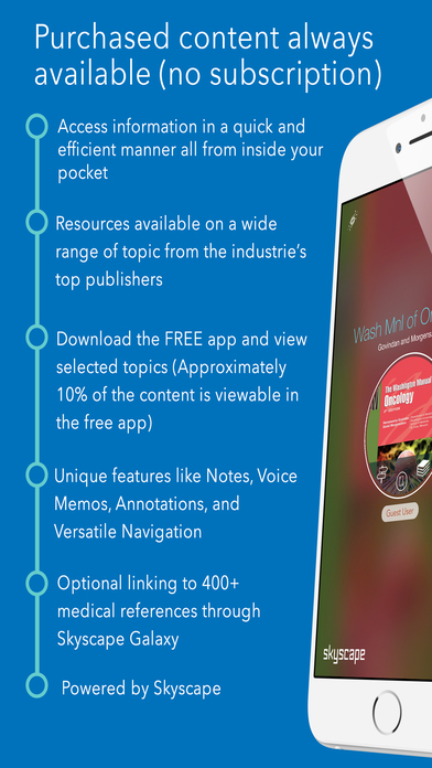 Download the FREE app and view selected topics (Approximately 10% of the content is viewable in the free app and tapping on the locked topic will launch the in-app purchase screen). ABOUT: Washington Manual™ of Oncology Better understand innovative developments in oncology with new chapters on Genome Sequencing, Personalized Therapy, Endocrine Tumors, Myelodysplastic Syndromes, Anti-emesis and Survivorship. Based on: 3rd Edition Author: Ramaswamy Govindan, MD; Daniel Morgensztern, MD Publisher: Wolters Kluwer Health | Lippincott Williams & Wilkins SPECIAL FEATURES: Locate a disease, symptom or medication in the fastest possible manner: - Use Spotlight Search from Home screen - Tap and Hold launch icon to open Last Topic, History, Favorites .. - Navigate using multiple indices - History to open frequently visited pages - Bookmarks NEVER FORGET ANYTHING: Mark topics with relevant information: - Rich-text notes - Voice memos - Annotations with scribble, doodle or text You choose the method to note this regardless of the context you are in to ensure that the important facts are available whenever you access the topic, whether it is tomorrow or six months from now. FULL DESCRIPTION: Get the latest, most reliable cancer management recommendations in the famous fast-access Washington Manual® outline format! Concise, clearly written sections on principles of oncology, site-specific diseases, and supportive therapy make The Washington Manual® of Oncology, 3rd Edition, an invaluable resource for the daily care of cancer patients. The Washington Manual® is a registered mark belonging to Washington University in St. Louis to which international legal protection applies. The mark is used in this publication by LWW under license from Washington University. KEY FEATURES - Better understand innovative developments in oncology with new chapters on Genome Sequencing, Personalized Therapy, Endocrine Tumors, Myelodysplastic Syndromes, Anti-emesis and Survivorship. - Focus on new ideas in the field thanks to a greater emphasis on molecular diagnosis, genome sequencing, and targeted therapies. - Quickly locate key information in the appendices, such as body surface area, dose adjustments of chemotherapy agents in renal and hepatic failure, and online resources for oncologists. - Benefit from proven treatment recommendations from the experts at Washington University in St. Louis – ideal for the busy third and fourth year student, resident, or clinician.